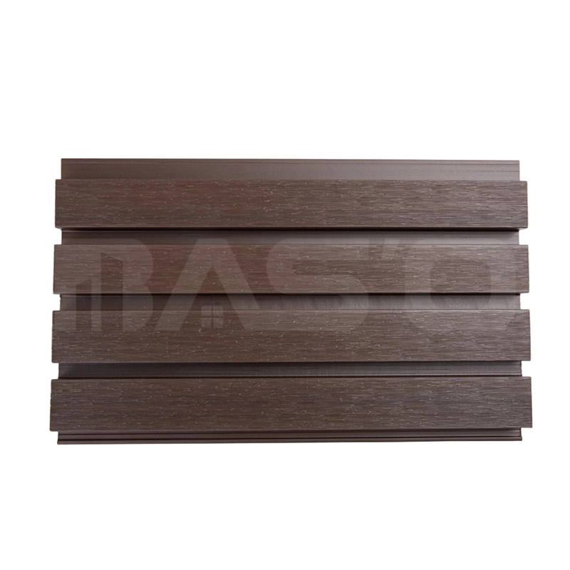 Este panel de pared compuesto de coextrusión de listones anti-UV de fibra de madera natural de 219 mm x 26 mm está hecho de 55% de fibra de madera natural y 35% de plástico HDPE reciclado. Se combina con adhesivos especiales y colores estables para conservar la textura natural y el tacto de la madera y al mismo tiempo mejorar la durabilidad.